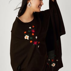 Bring a boho-chic styling to your winter wardrobe with this poncho. Showcasing a mock shawl design, it features a round neck, floral embroidery cape sleeves, and an asymmetric hem. Complete the look with a crop top, pair of leggings and mules.