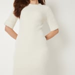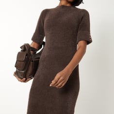 This fitted, knitted bodycon dress features a fancy, feathery-like texture, with a round neck and half-sleeves that have buttoned, rolled-up cuffs. Elegant and comfortable for day-to-night wear.