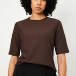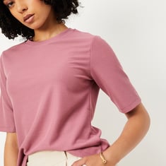This knit t-shirt offers a snug, flattering fit with a soft stretch texture. Featuring a round neck and half sleeves, it's a versatile staple for effortless, everyday style.