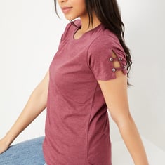 Give your casual look an updated style with this top rendered in a solid tone. It is highlighted with a slit sleeve with button accents and a step hem. A round neck and step hem complete the look.