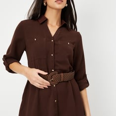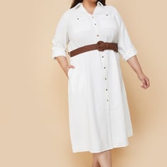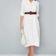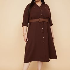 Chic and versatile, this solid shirt midi dress with belt is a timeless wardrobe staple. Featuring a button closure and full sleeves with button cuffs, it blends classic structure with everyday elegance. Model Size :