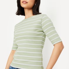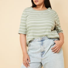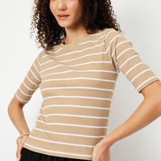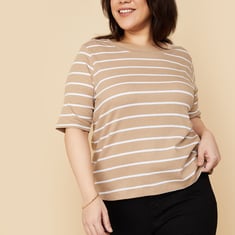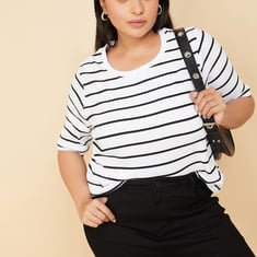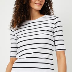 A perfect addition to your casual wardrobe, this T-shirt features a timeless striped pattern. Designed with a round neckline and half sleeves, it effortlessly combines comfort and style for your everyday look. Model Size :