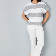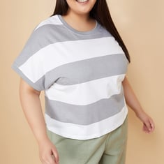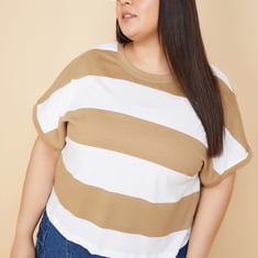 Keep it casual and stylish with this striped T-shirt. Featuring a round neck, extended half sleeves, and a straight hem, it offers a timeless look that’s perfect for everyday wear. Model Size :