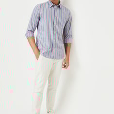 A timeless addition to your wardrobe, this shirt is highlighted with a striped pattern. The slim fit profile lends a flattering style. The features include a spread collar, full sleeves with buttoned cuffs, and a patch pocket on the chest. The curved hem completes the look.
