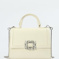 Add a hint of shine to your outfit. This sling bag has a detachable chain strap. The bag has a handle at the top, a flap with an embellished accent and a magnetic button closure. It has a compact compartment with an interior zip pocket.