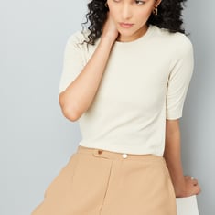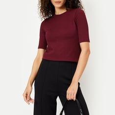 This ribbed top features a classic round neck and half sleeves, offering a comfortable yet stylish look. The ribbed texture adds subtle detail, making it a versatile piece for wearing on its own. Ideal for casual outings or relaxed days.