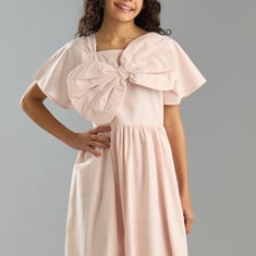 Girls Solid Dress with Front Bow
