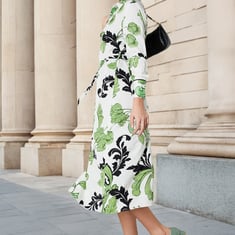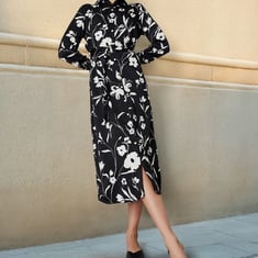 Step into effortless elegance with this dress. Featuring a bold, eye-catching print and a flattering belted waist, it combines comfort with style. The classic shirt dress silhouette is defined with a fabric belt. It has a spread collar, full sleeves with buttoned cuffs, and a midi-length profile.