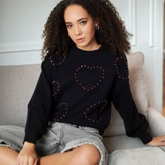 Stay cozy and stylish with this heart-pattern rhinestone-studded sweater, perfect for adding a touch of sparkle to your wardrobe. Featuring a crew neck and full sleeves, it offers both warmth and charm.