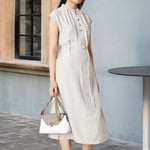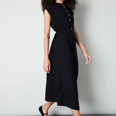 This textured belted midi dress exudes understated elegance with a band collar neck, extended sleeves, and side slits for ease of movement. The button closure and waist belt add structure to its relaxed silhouette, making it perfect for both casual and semi-formal occasions.