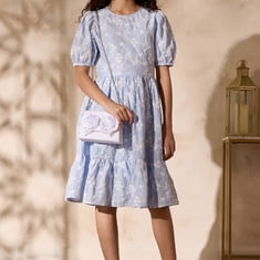 This embroidered fit and flare dress offers a blend of elegance and charm. Featuring a round neck, puff sleeves, and a flounce hem, it’s beautifully detailed with intricate embroidery for a feminine, stylish look perfect for any occasion.
