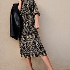 Set elegance in motion with this midi-length dress. It features a flattering midi length and a soft plisse texture that adds subtle depth and movement to your look. The tie-up neck detail offers an elegant look, while the fabric tie-up adds definition. The prints add a bold look.