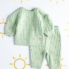Keep your little one cosy and stylish with this adorable quilted sleepwear set. Designed for ultimate comfort, the set features a full-sleeve, round-neck sweatshirt and matching joggers, both adorned with a playful print. Crafted from soft cotton material, this charming ensemble ensures all-day comfort, making it perfect for snuggles and sweet dreams.