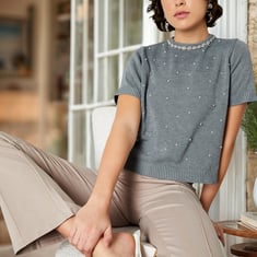 A perfect mix of comfort and glamour, this sweater is a must-have this season. It has a mock neck with rhinestone embellishments for a hint of sparkle. The pearl detailing adds a classic look, while the half sleeves provide a flattering look.