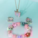 Your little fashionista will create infinite looks with this set. The chain with a lobster clasp features interchangeable pendants, allowing her to customise her look. Paired with a beaded and floral bracelet, this set offers versatility and charm, making it perfect for every occasion.