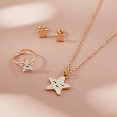 A perfect match for your little star, this set is brimming with sparkle and delight. It includes a chain with a star pendant, a pair of star earrings with push-back closure, and an adjustable finger ring.