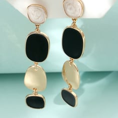 Elevate your look with the geometric flair this pair of earrings offers. It features a chic, tiered design that combines modern geometry with a touch of elegance. Each earring is thoughtfully crafted with stones and sleek finishes, creating a dynamic, eye-catching effect. They are secured with post and back closure.