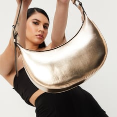Glam up your day or night with this crescent-shaped bag. It has a metallic finished exterior, a short strap with grommets, and buckle detail. The compact main compartment with a zip top is perfect for your everyday essentials.