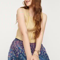 Jazz up your outfit with this crop top, which is peppered with sequins for added style. It is designed with a square neck, sleeveless profile, and button closure at the back. The product comes with additional sleeves. Team this top with a maxi skirt and block heels for an elevated look.