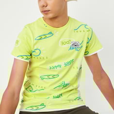 Get your little one vacation-ready with this comfortable and stylish all-over printed T-shirt featuring short sleeves and a crew neck.