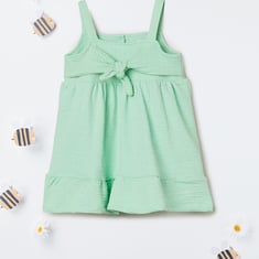 This knit dress combines charm and comfort in a playful silhouette. Featuring a square neck, button closure, and sleeveless design, it’s detailed with a back tie-up and a flounce hem for a feminine touch.