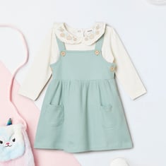 Ribbed pinafore dress with a square neck and half sleeves, paired with a top featuring a peter pan collar and full sleeves. This duo blends classic charm with modern style for a polished, layered look.