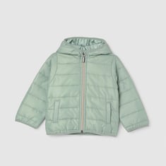 Enhance your little one's style quotient with this puffer jacket that features full sleeves, a front zip-up closure, a hoodie and two pockets. The solid pattern lends a smart look.