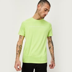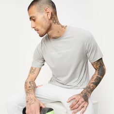 Get ready for gym in style in this T-shirt. It features a crew neck, short sleeves, and a typographic print on the chest. Team up this tee with a pair of active shorts and sneakers to complete the look.