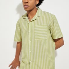 This oversized resort shirt features a stylish striped design with a relaxed resort collar and half sleeves for a cool, laid-back look. The button placket adds a touch of classic style, making it perfect for both casual outings and vacation vibes.