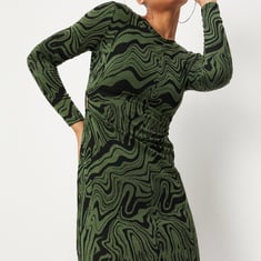 Make heads turn in this mini dress with abstract prints. It is fashioned in a bodycon profile with a mock neck, long sleeves, and cut-outs at the side waist. Complete the look with combat boots and sunglasses.