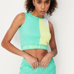 Tackle your workouts in the comfort of this cropped top with a ribbed pattern. It features a crew neck, sleeveless construction, a colourblock design, and a printed hem. Team up this top with tights and sneakers.