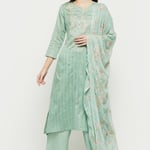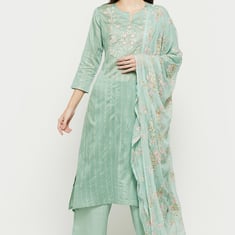 This kurta set is complemented with an embroidered kurta designed with a notch neck, three-quarter sleeves along with a pair of palazzo pants, and a matching dupatta to ensemble the complete look.