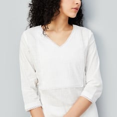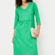Exude elegance in this kurta, highlighted by a beautifully embroidered yoke. It features a V-neck, three-quarter sleeves, and a convenient waist pocket, offering both style and functionality.