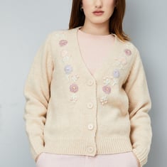 Embrace the season in style with this cardigan, featuring exquisite floral embroidery that adds a touch of elegance. The V-neck, full sleeves, and front button placket enhance its classic charm, making it a versatile piece to elevate any outfit.