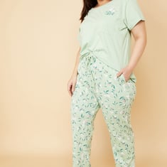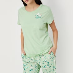 Relax and chill with this quirky printed sleepwear set. It includes a T-shirt with a round neck, half sleeves and a patch pocket along with a pair of matching all-over printed pyjamas with an elasticated waist and drawstring.