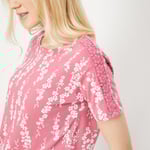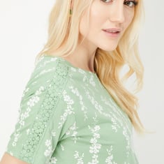 Elevate your casual wardrobe with this T-shirt with floral prints. It is styled with a round neckline and half sleeves with lace detail.