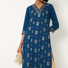 Embrace effortless elegance with this foil print straight kurta. Featuring a V-neck, 3/4th sleeves, side slits, and a convenient side pocket, it blends comfort with timeless style.