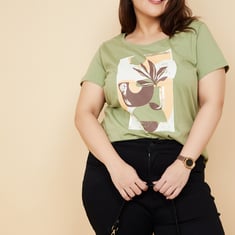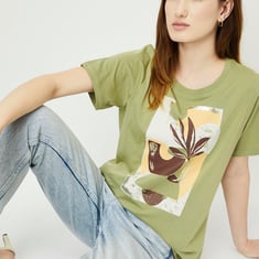 Boost your casual wardrobe with this stylish graphic-printed T-shirt. Featuring a round neck and short sleeves, it perfectly showcases your unique vibe.