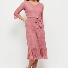 Upgrade your style quotient with this midi dress designed with a lace overlay, a V neckline, three-quarter sleeves, and a tie-up waist. Team up this dress with heels and a handheld bag for an elegant look.