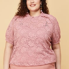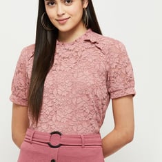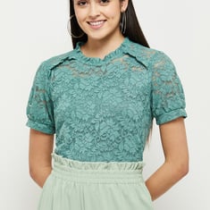 Make a style quotient with this casual top designed with a lace design, a round neckline with frills, and short sleeves.