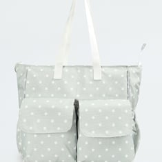Designed for travelling with infants, this diaper bag features polka dots. It features flat handles, a convenient strap, and front flap pockets. The main compartment includes a mesh divider with a changing mat for convenience.