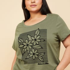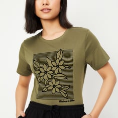 Ready to level up your casual style? This printed T-shirt for women features a trendy round neck and comfy half sleeves, perfect for those laid-back days. Model Size :