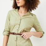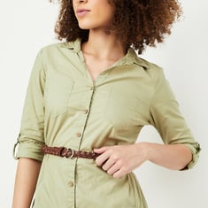 Slay your day in style with this chic tunic rendered in a solid tone. It features a spread collar, full sleeves with roll tabs, and a belted waist for a flattering silhouette. The patch pockets on the chest and waist pockets add practicality, while the curved hem brings a touch of elegance.