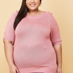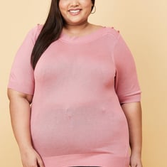 Look fashionable in this knit top featuring a boat neckline, buttons at the shoulders, half sleeves, and ribbed trim.