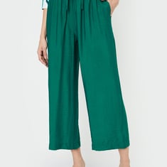 This pair of palazzos is designed with a solid surface and an elasticated waistband with a drawstring, ensuring comfort all day long. Featuring convenient side pockets, they effortlessly combine practicality with style.
