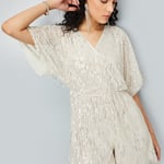 Sparkle and shine with this stunning playsuit. Designed with an all-over sequined finish, it features a flattering V-neck and a cinched waist that enhances your silhouette while adding a touch of elegance. The half sleeves provide a chic balance, making it perfect for parties or special occasions.