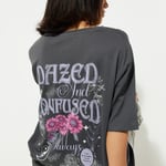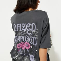 Achieve a relaxed yet stylish look with this tee boasting an oversized graphic print on the back, along with half sleeves and a round neckline for a contemporary touch.