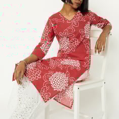 Step out in graceful style with this floral print straight kurta. Featuring a V-neck, three-quarter sleeves, a pocket, and side slits, it combines elegance with a comfortable fit.