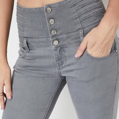 Featuring a solid surface, this pair of skinny-fit jeans is complemented with a button closure, insert and patch pockets. Team this with a printed tee and sneakers for a stylish ensemble.