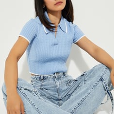 This braided knit T-shirt with a Johnny collar, half sleeves, and contrast trim, combines sporty and casual vibes. The Johnny collar adds a touch of structure, while the cropped length gives it a trendy, modern look.